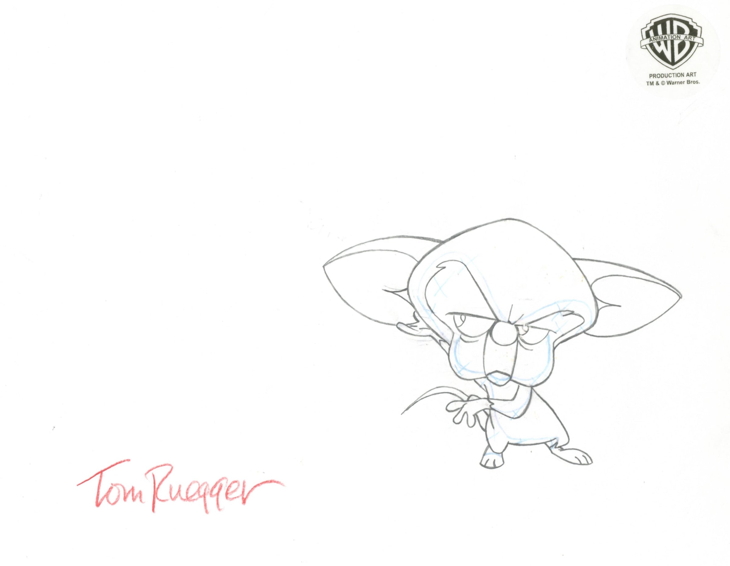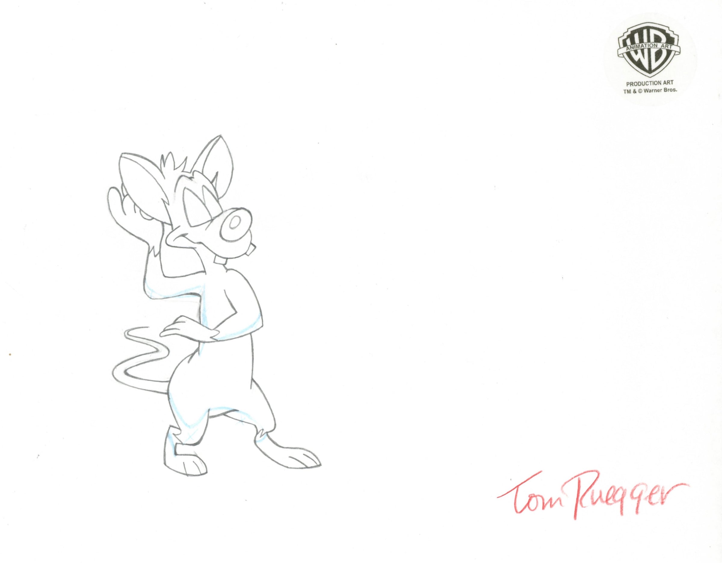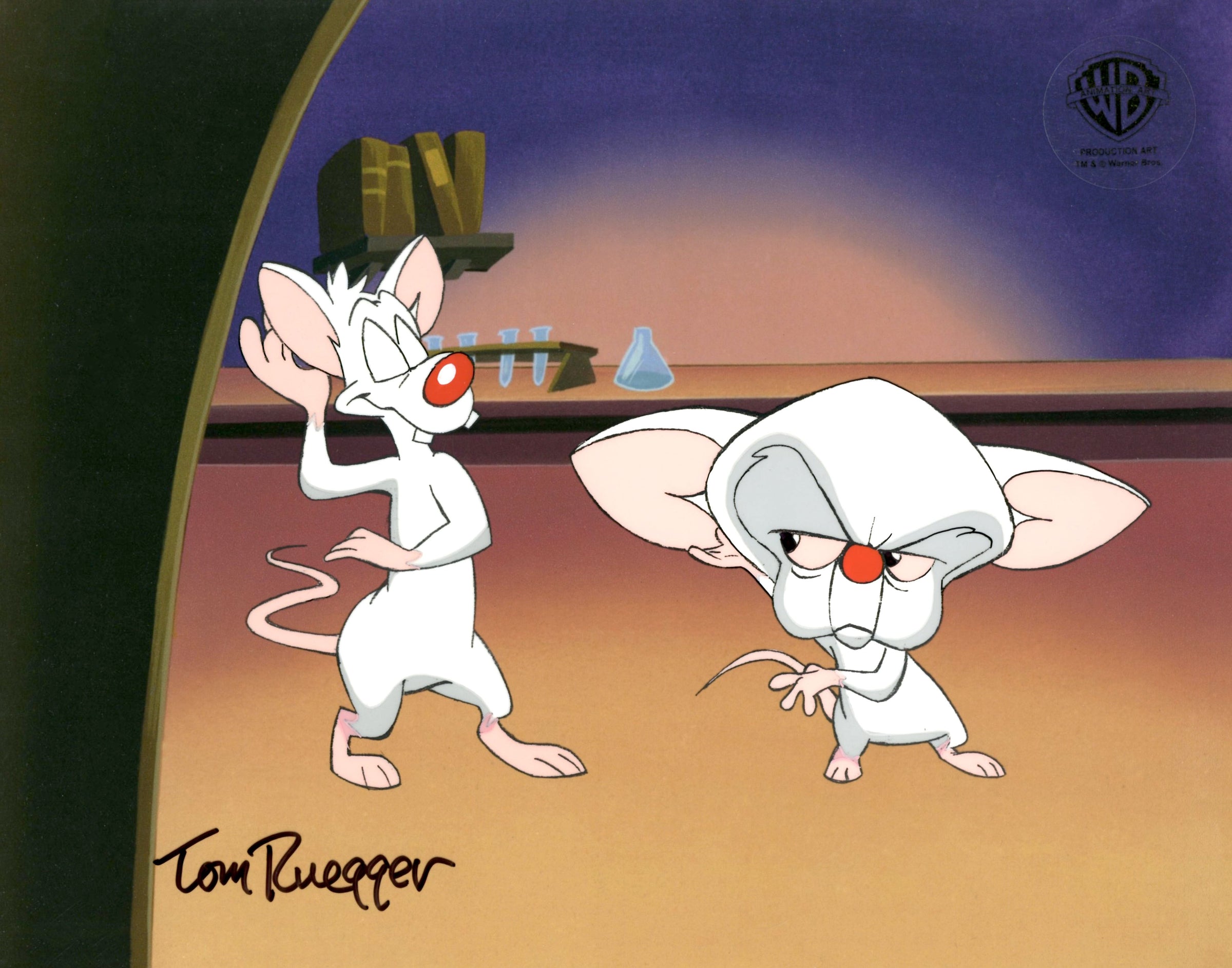 ABOUT THE IMAGE: Pinky and the Brain is a cartoon that follows a self-proclaimed genius, The Brain, and his dimwitted sidekick, Pinky, as they try to conquer the world. Pinky and the Brain was the first animated television series to be presented in Dolby Surround. It was created by Tom Ruegger and the fourth collaboration between Steven Spielberg's production company, Amblin Entertainment and Warner Bros. Animation. The characters first appeared in 1993 as a recurring skit on the show Animaniacs. Thanks to its popularity it was later spun off as a series. There were 66 episodes produced. This piece comes with a certificate of authenticity.