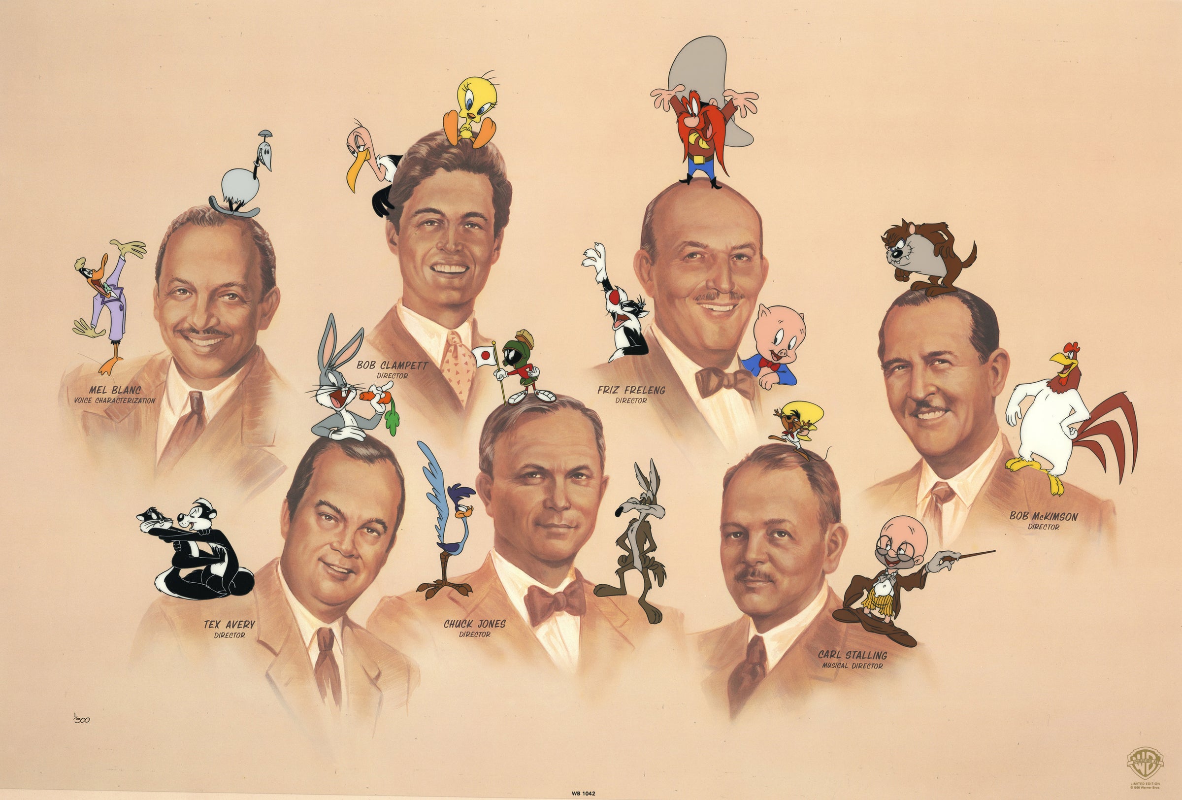 ABOUT THE IMAGE: This very special limited-edition animation cel represents the first time that Warner Brothers’ own Masters of Animation can be seen grouped together, surrounded by the characters that they made famous. The Masters represented are: directors Tex Avery, Bob Clampett, Friz Freleng, Chuck Jones and Bob McKimson. Also included are the inimitably talented Mel Blanc, the unparalleled voice artist, and Carl Stalling, whose musical direction was instrumental in the making of the Looney Tunes/Merrie Melodies cartoons.