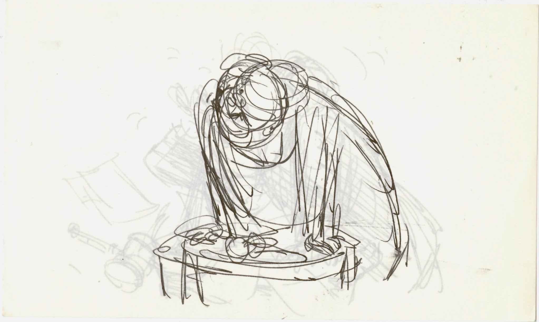The storyboards were all created by the exceptional writer and story artist Ted Berman (1919 - 2001), who contributed to a variety of Disney films, shorts, and featurettes including The Black Cauldron and The Fox and the Hound. The storyboards and prints were largely created for: the sequence at the beginning of the film with the Rescue Aid Society where Bernard and Bianca are introduced, starting at roughly 6:22; the chase sequence where Madame Medusa, Mr. Snoops, and Medusa's crocodiles hunt Bernard and Bianca, starting at around 46:49; and the fight sequence at about 1:09:31 when Ellie Mae and crew help Bernard and Bianca fight off Madame Medusa.